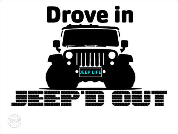 Our 4mm thick 24″ wide x 18″ tall corrugated plastic props are the perfect addition to your delivery. This Drove in, JEEP’D OUT! prop is perfect for your Dealership. Your dealership, sales team and the customer can post it on social media. Posting the delivery photo on social media will spur engagement by friends and family, about their purchase, which can turn into MORE SALES for your dealership!