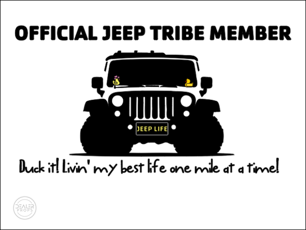 Our 4mm thick 24″ wide x 18″ tall corrugated plastic props are the perfect addition to your delivery. This OFFICIAL JEEP TRIBE MEMBER. Duck it! Livin my best life one mile at a time! prop is perfect for your Dealership. Your dealership, sales team and the customer can post it on social media. Posting the delivery photo on social media will spur engagement by friends and family, about their purchase, which can turn into MORE SALES for your dealership!