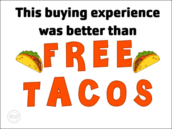 Our 4mm thick 24″ wide x 18″ tall corrugated plastic props are the perfect addition to your delivery. This The buying experience was better than FREE TACOS! prop is perfect for your Dealership. Your dealership, sales team and the customer can post it on social media. Posting the delivery photo on social media will spur engagement by friends and family, about their purchase, which can turn into MORE SALES for your dealership!