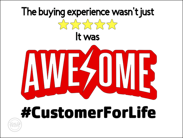 Our 4mm thick 24″ wide x 18″ tall corrugated plastic props are the perfect addition to your delivery. This The buying experience wasn’t just 5 stars, it was AWESOME! Customer For Life! prop is perfect for your Dealership. Your dealership, sales team and the customer can post it on social media. Posting the delivery photo on social media will spur engagement by friends and family, about their purchase, which can turn into MORE SALES for your dealership!