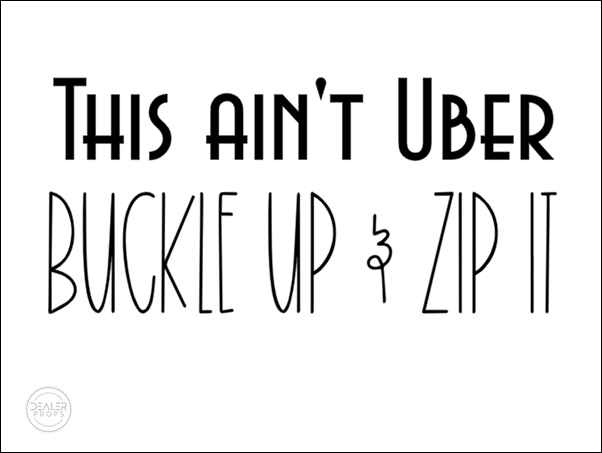 Our 4mm thick 24″ wide x 18″ tall corrugated plastic props are the perfect addition to your delivery. This THIS AINT UBER! BUCKLE UP & ZIP IT! prop is perfect for your Dealership. Your dealership, sales team and the customer can post it on social media. Posting the delivery photo on social media will spur engagement by friends and family, about their purchase, which can turn into MORE SALES for your dealership!